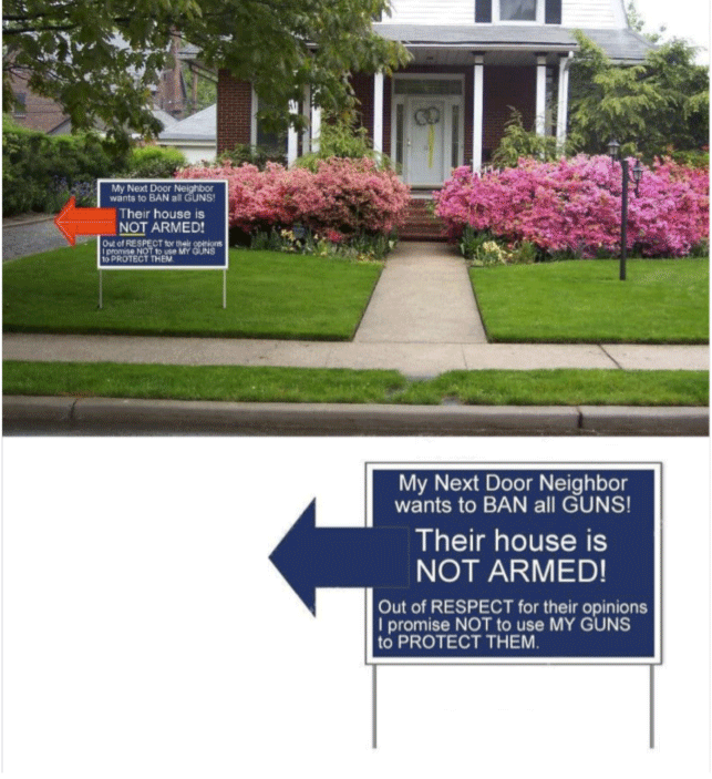 check out my neighbor's house...he wants to ban guns. Don't worry I won't use my gun to protect him from you!!!