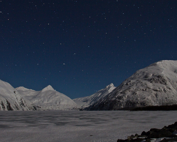 Night photography at Portage Lake at Portage, Alaska 16mm wide angle lens, f/2.8 for 25 seconds, manual focus, iso 800.