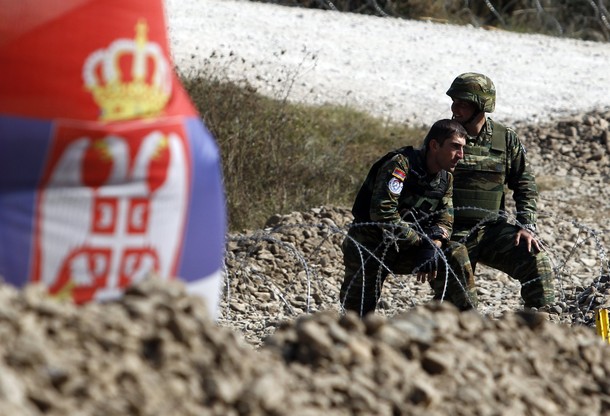 Kosovo Force (KFOR) soldiers from Armenia stand guard at a barricade at the closed Serbia-Kosovo border crossing of Jarinje September 30, 2011. NATO peacekeepers in Kosovo (KFOR) destroyed a Serb barricade at a contested northern border crossing with Serbia on Friday, but the local Serbs soon set up another one a little further away.