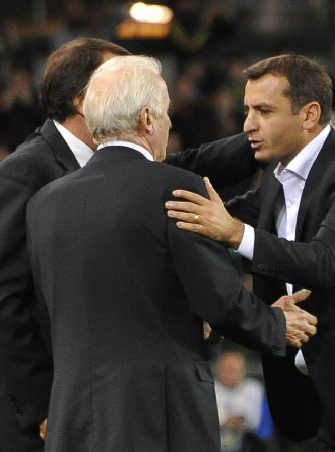 Armenian head coach, Vardan Minasyan, congratulates Irish coaching team (Trapattoni and Tardelli)